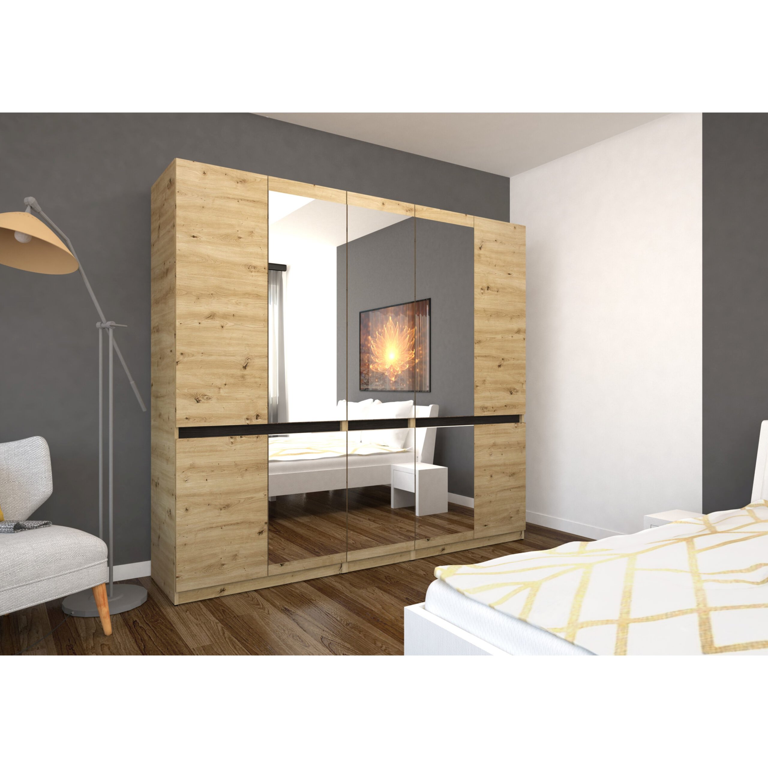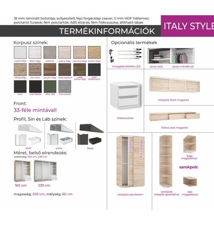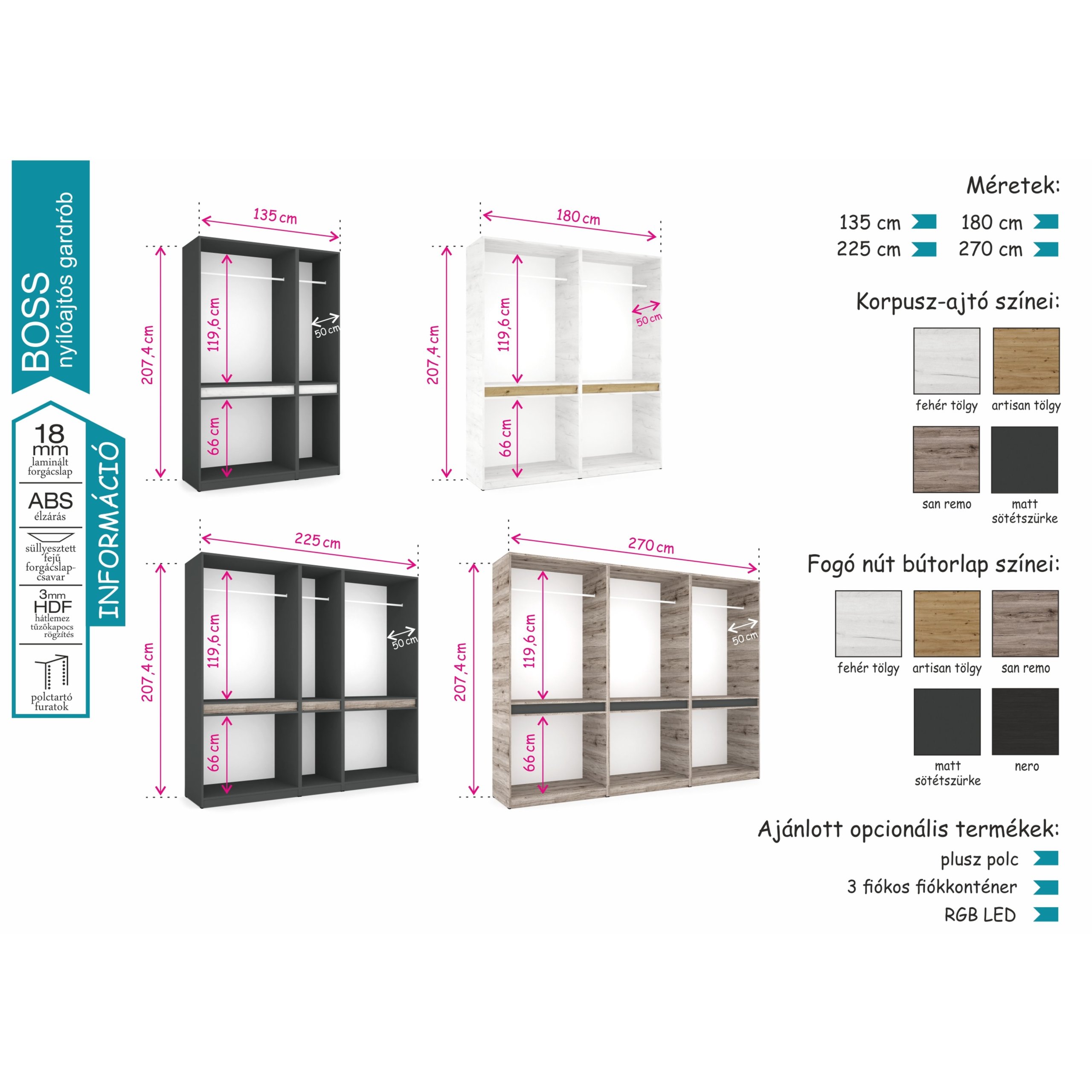A Boss gardrób előnye letisztult, modern megjelenése és személyre szabható belső elrendezése. Az alap mándlirudas belső kiegészíthető 3 fiókos fiókkonténerrel vagy akár polcokkal is, az egyéni igényeknek megfelelően. A tükrös illetve tükör nélküli kivitelhez is rendelhető RGB LED, hogy a hálószoba még hangulatosabb legyen. A fogó nút bútorlap színei szabadon variálhatóak a gardrób színeivel.