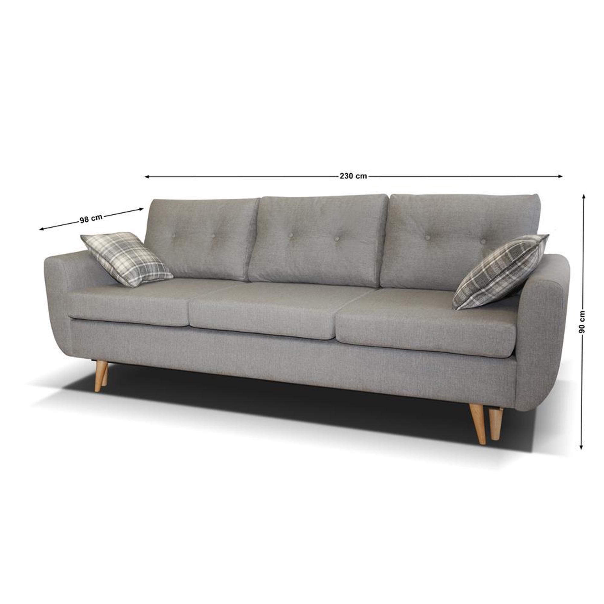 Méretek (3-as kanapé): külső méret: 230 x 98 cm, fekvőfelület: 200 x 140 cm, ülőmagasság: 45 cm, beülőmélység: 79 cm, beülőmélység (párnával): 60 cm, háttámlamagasság: 90 cm