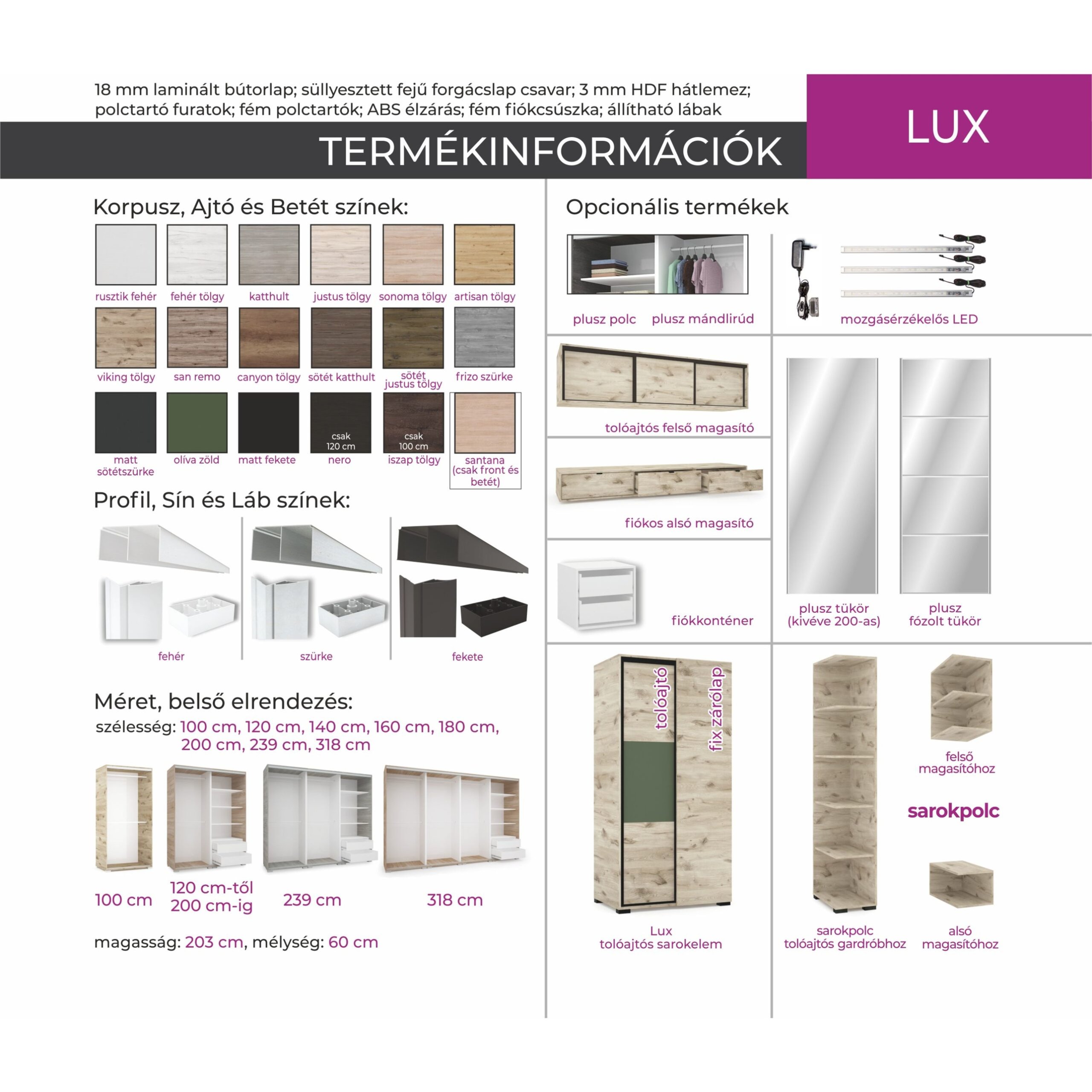 artisan tölgy, Canyon tölgy, Fehér tölgy, Frizo szürke, Justus tölgy, Katthult, Matt fekete, Matt sötétszürke, Oliva zöld, Rusztik fehér, San remo, Sonoma tölgy, Sötét Justus tölgy, Sötét Katthult, Viking tölgy