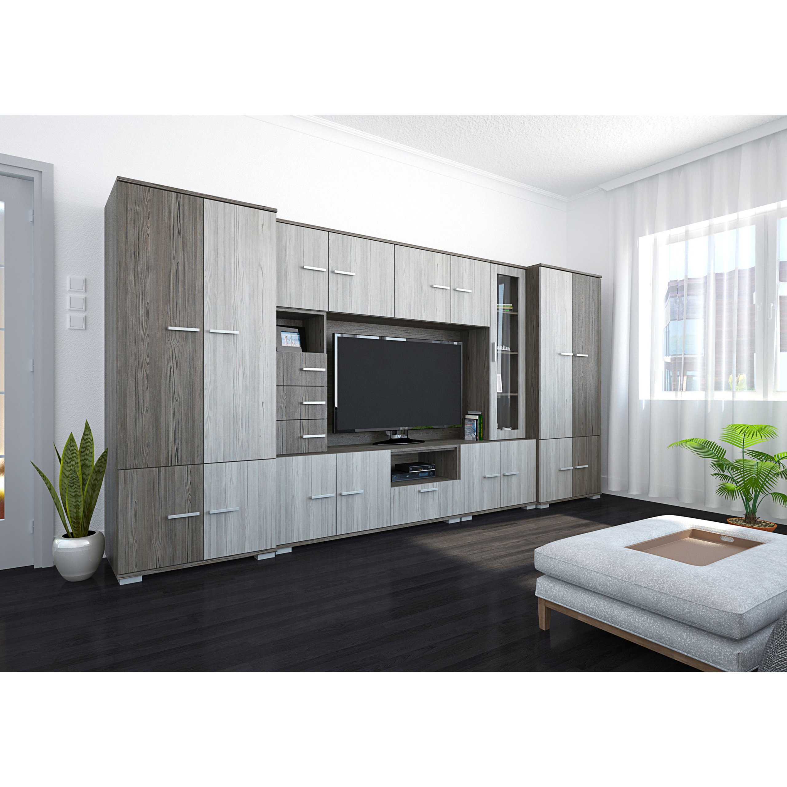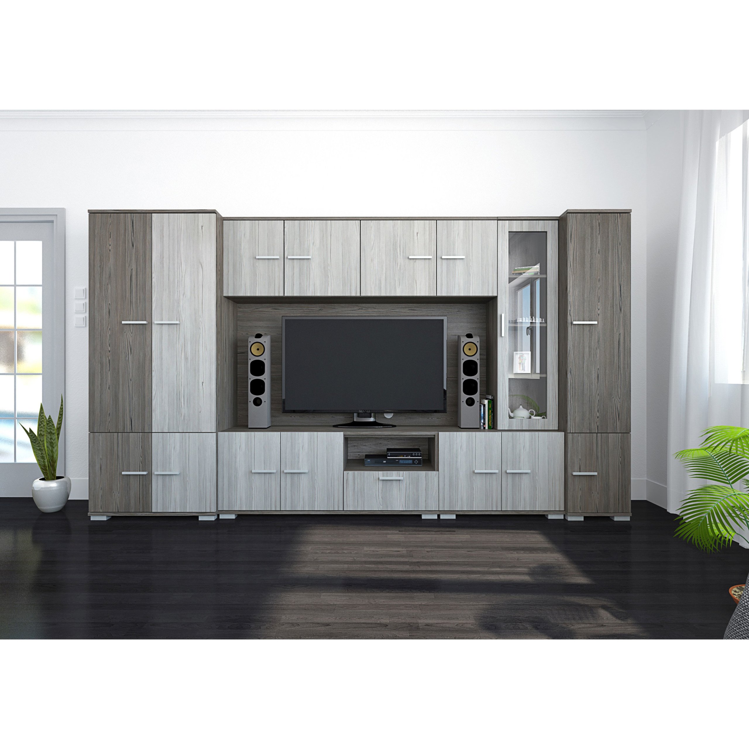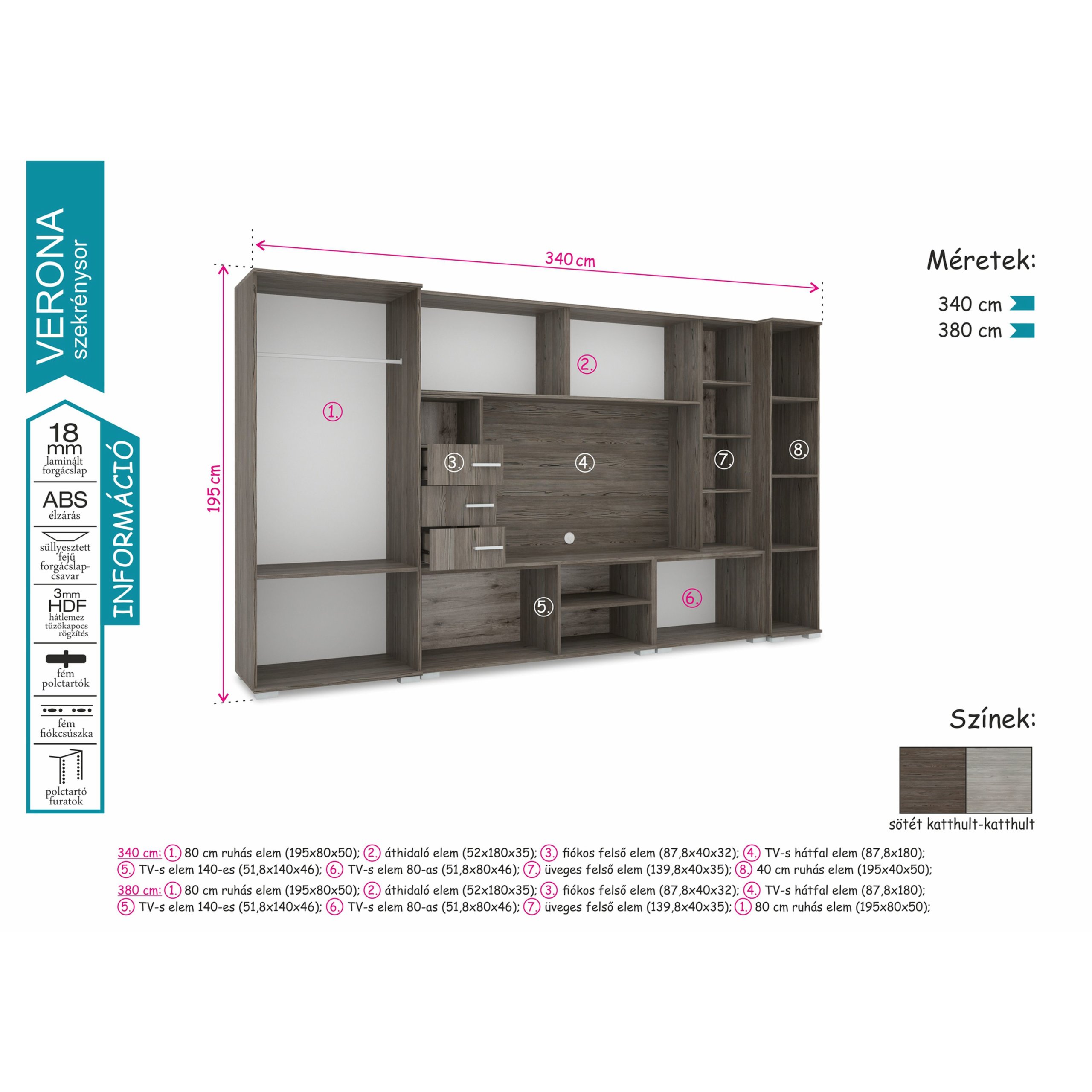 A Verona szekrénysor megjelenésével számos nappali éke lehet. Két méretben érhető el, 340 és 380 cm-es kivitelben. Sötét katthult és katthult színeivel harmónikus összhangot teremt bármely helyiségben. Nagyon jól pakolható, jól tervezett belső tereiben mindennek meglesz a megfelelő helye.